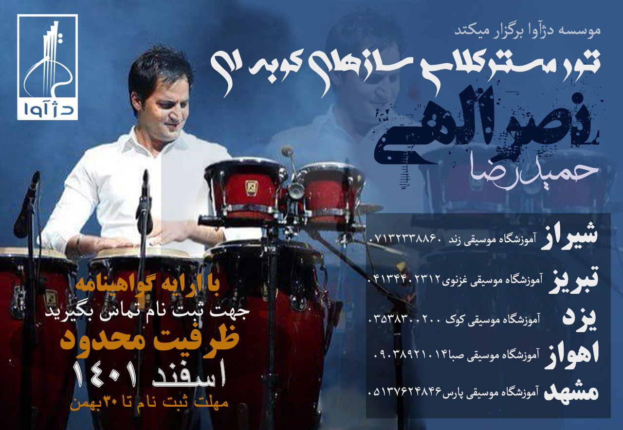 به گزارش روابط عمومی مؤسسه فرهنگیـهنری دژآوا، تور مسترکلاس تخصصی سازهای کوبهای با تدریس حمیدرضا نصرالهی، نوازنده و مدرس برجسته موسیقی کشور، از ابتدای اسفندماه ۱۴۰۱ در پنج شهر ایران برگزار میشود.